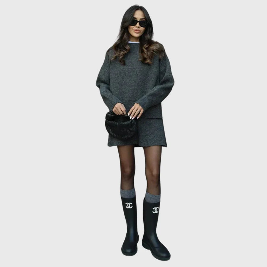Este conjunto de punto acogedor a juego es la elección perfecta para un look moderno, elegante y cómodo. Fabricado en tejido de poliéster, ofrece calidez y estilo a partes iguales, ideal para otoño e invierno. El jersey de corte holgado aporta un aire casual chic, mientras que la falda equilibra el conjunto con un toque femenino y sofisticado.